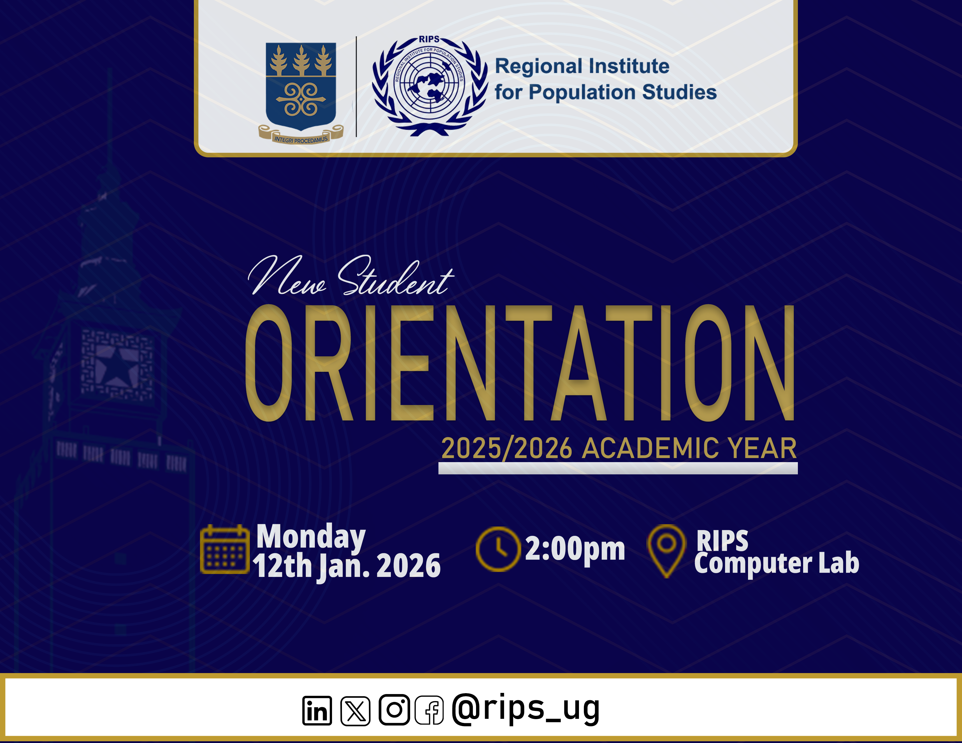 The Regional Institute for Population Studies (RIPS) will hold an orientation programme for newly admitted students for the 2025/2026 Academic Year on Monday, 12 January 2026 at 2:00 PM.